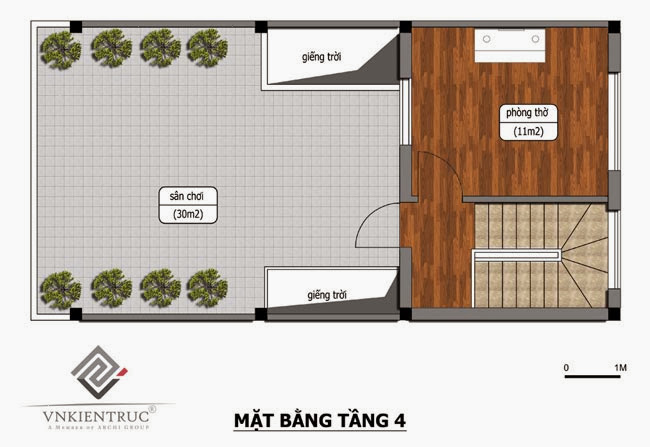 - Tầng 4, phòng phía sau được thiết kế làm phòng thờ. Phía trước sẽ là sân vừa để phơi vừa kết hợp làm sân chơi.
