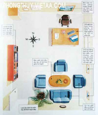 - Phòng nghiên cứu ở hướng Đông Bắc, tượng trưng cho kiến thức. Bàn tiếp tân trông ra cửa hướng Đông, có cây cảnh tượng trưng cho hành Mộc, sức sống vươn lên. Ban Tài ngân đặt ở hướng Đông Nam (đại diện cho tiền tài, thịnh vượng), bể cá ở đây tăng thêm ý nghĩa "vượng tài". Tiếp thị Marketing ở hướng Nam tượng trưng cho danh vọng, hành Hoả cũng được tăng khí lực nhờ màu ghế đỏ. Phòng nhân viên hướng Tây Nam giúp thêm tình cảm hài hoà. Phòng Quản trị và kế hoạch ở hướng Tây kích thích ý tưởng mới lạ. Phòng Mãi dịch ở hướng Tây Bắc, hành Kim, rất hợp công việc buôn bán, đắc lợi.