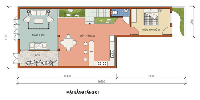 - Kích thước mặt tiền 7,1 m là khá thoải mái. Chúng tôi có bố trí một lối vào trực tiếp phòng khách và một lối phụ. Cổng phụ đi vào là không gian nhỏ để xe cũng như lối đi kín đáo cho người nội trợ. Ngay sau phòng khách là bếp và phòng ăn. Bếp có một quầy bar nhỏ thư giãn và giải khát, kế bên đó là một tiểu cảnh cây xanh và nước. Tiểu cảnh trang trí làm sinh động thêm không gian sống.