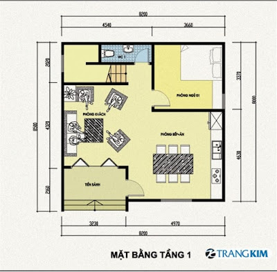 Tầng 1: Theo như yêu cầu của gia chủ, tầng một sẽ bố trí không gian phòng khách kết hợp nơi thờ cúng giống như những ngôi nhà truyền thống xưa. Bếp ăn, phòng ngủ và một vệ sinh nhỏ dưới gầm cầu thang. Phòng khách và bếp ăn thiết kế liên thông nhau tạo cảm giác trải dài và rộng rãi. Một thuận lợi nữa khi phòng khách và bếp ăn bố trí trong cùng một không gian chính là tính linh hoạt, tiện lợi khi đi lại, sinh hoạt.